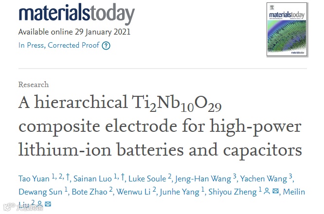近日,上海理工大学郑时有教授团队与美国佐治亚理工学院的刘美林教授合作,在国际知名期刊Materials Today上发表题为“A hierarchical Ti2Nb10O29 composite electrode for high-power lithium-ion batteries and capacitors”的文章。