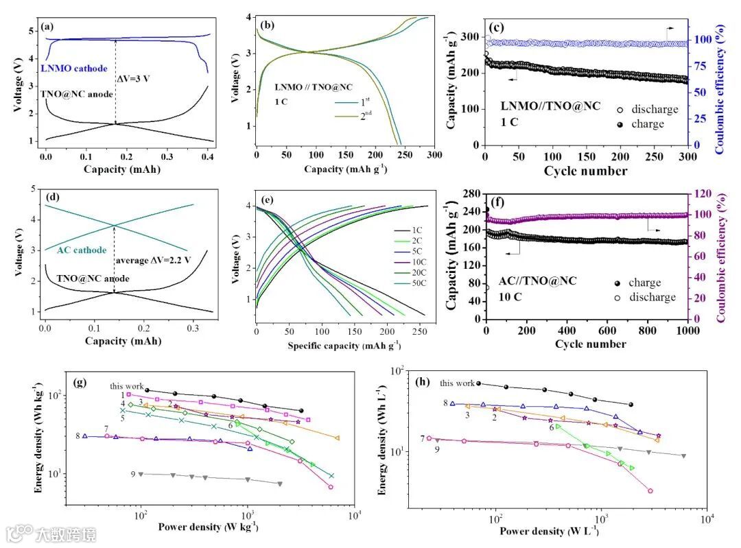 图6. TNO@NC作为负极的全电池性能:在1C倍率下 (a)正极LNMO||Li和负极TNO@NC||Li的充放电曲线;LNMO||TNO@NC全电池的(b)前三圈充放电曲线和(c)循环性能。(d)在1C倍率下正极AC||Li和负极TNO@NC||Li的充放电曲线;AC||TNO@NC锂离子电容器(e)在1 C至50 C的充放电曲线;(f)10C倍率下的循环性能;质量(g)和体积(h) 能量和功率密度的Ragone图以及与其他报道的锂离子电容器和钠离子电容器性能比较。