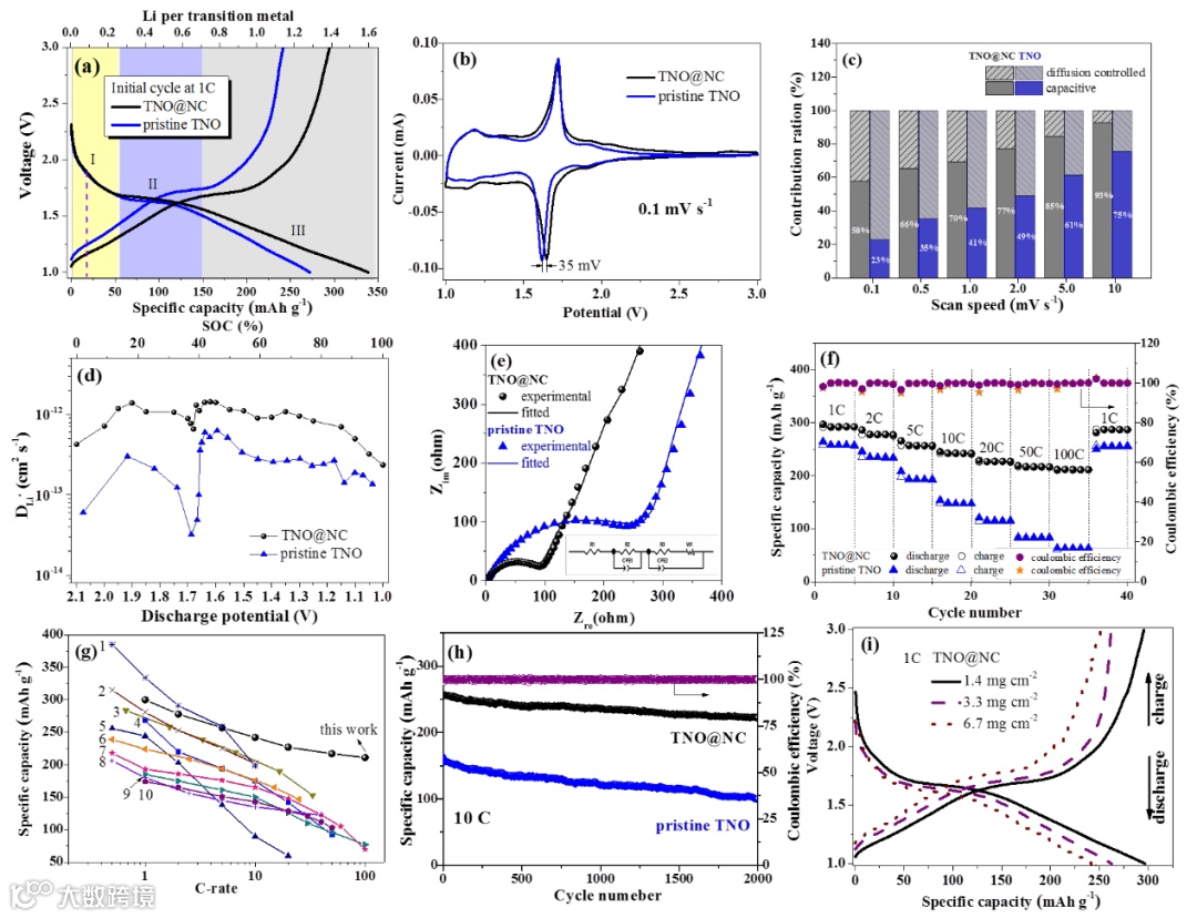 图5. TNO@NC复合电极和纯Ti2Nb10O29电极的电化学性能:(a) 在1C倍率下的初始充放电曲线和对应的Li+嵌入量;(b) 在0.1mV s-1扫描速率下的循环伏安曲线;(c) 在不同扫描速率下的电容和扩散控制容量的贡献率;(d) 恒电流滴定计算得到的锂离子扩散速率;(e) 电化学阻抗谱;(f) 倍率性能;(g) TNO@NC电极的倍率性能与先前报道的铌和钛基负极材料性能对比;(h) 循环性能对比;(i) 在1C倍率下TNO@NC复合电极不同担载量的充放电曲线。