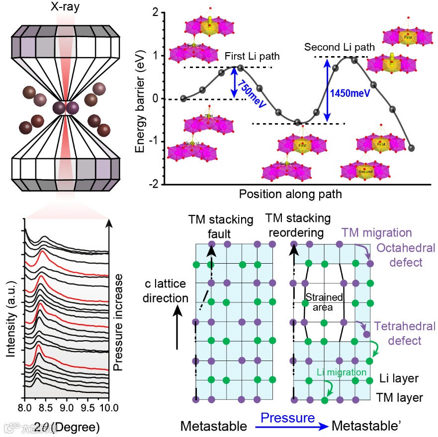 近期,这两个研究团队与来自西班牙马德里康普顿斯大学和上海同步辐射光源的研究团队合作,进一步探索亚稳定性结构在不同压力作用下的变化情况,发现了富锂材料具有结构柔韧性。
