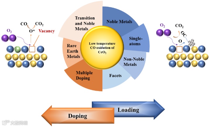 III、金属掺杂:在CeO2中掺入金属可以调节铈基催化剂中的氧空位浓度或改变催化剂的粒径。掺杂型铈基催化剂的活性取决于掺杂剂的性质、掺杂量、表面氧空位的浓度以及掺杂金属与CeO2之间的相互作用。