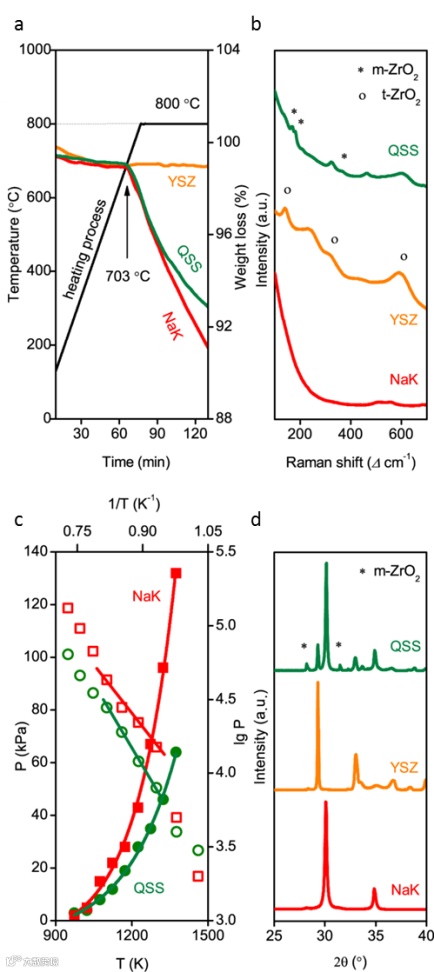图3 (a)TG曲线对比,(b)QSS电解质、NaK熔盐、YSZ纳米粉体在800℃下的原位拉曼光谱,(c)不同温度下的QSS电解质与NaK共晶盐的蒸气压,(d)QSS电解质、NaK盐以及YSZ纳米粉体的XRD结果