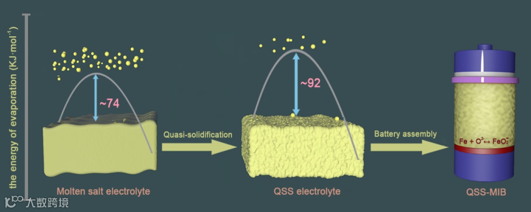 本篇观点展示了一种基于纳米级别的固体氧化物添加剂的新型半固态熔盐电解质(quasi-solid state,QSS),利用固体氧化物颗粒之间连接形成的网络骨架包裹液态熔盐电解质,形成了具有支撑性的电解质材料,实现了高温区半固态电解质的概念证明,探究了其在高温熔盐铁-空气电池(molten iron-air battery,MIB)中的应用潜力。同时研究了半固态熔盐电解质中固液相的作用机制以及电极与电解质界面处的电化学反应机制,这些研究将有助于建立一种更加简单有效的高温电池设计理念。