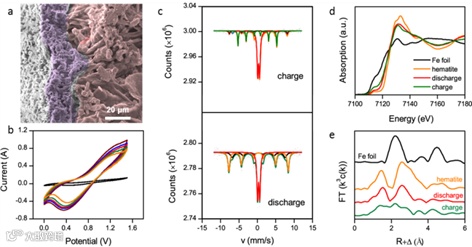 图5 QSS-MIB负极研究,(a)循环后电解质SEM图像,(b)不同扫速下负极CV测试,(c)充电后与放电后负极穆斯堡尔曲线,(d)吸收谱数据
