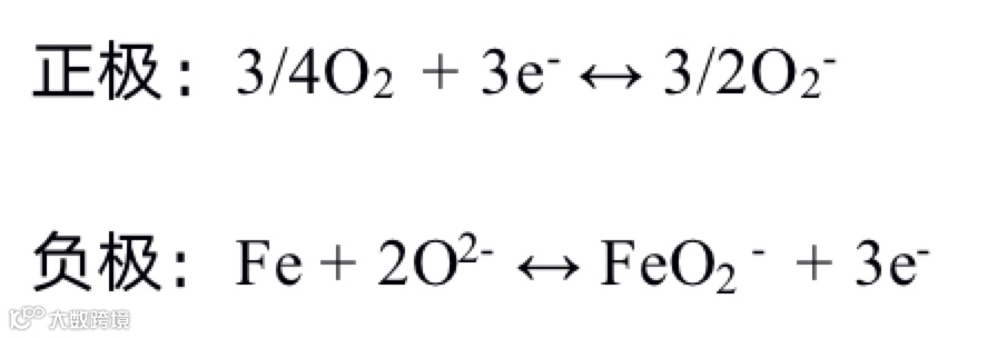 循环充放电之后QSS电解质的SEM结果表明,Fe在靠近负极端高度聚集,并非分布在整个电解质中,负极与电解质之间界面明显,负极端的电化学反应呈现的是固-固-液界面反应,显著区别于传统的以碳酸锂熔盐作为电解质的纯液态熔盐电池。CV结果表明负极端发生的是Fe(0)与Fe(Ⅲ)之间的转换过程。利用穆斯堡尔谱和吸收谱表征证明了负极端的反应是单质Fe和氧化铁与NaK熔盐反应形成的FeO2-之间的电化学反应过程,电池的反应机理可归结如下: