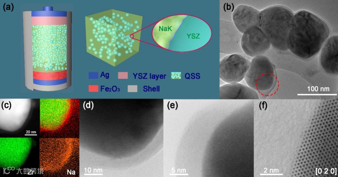 图2 (a)QSS-MIB示意图,(b)QSS电解质TEM图,(c)QSS电解质的EDS数据(d,e,f)不同放大倍数下NaK混合盐与YSZ纳米颗粒之间的界面区域