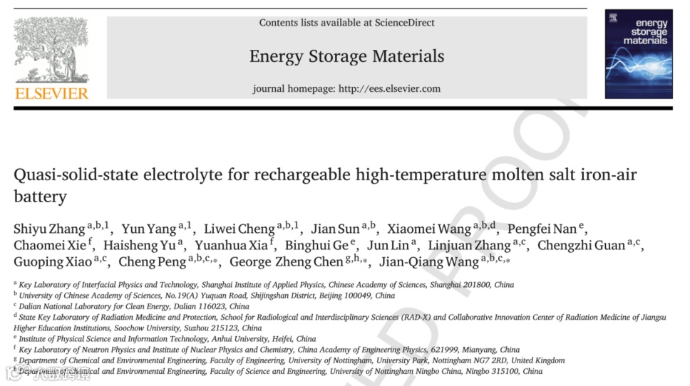 近日,来自中国科学院上海应用物理研究所王建强研究员团队宁波诺丁汉大学的陈政教授合作,在国际知名期刊Energy Storage Materials上发表了题为“Quasi-solid-state electrolyte for rechargeable high-temperature molten salt iron-air battery”的文章。