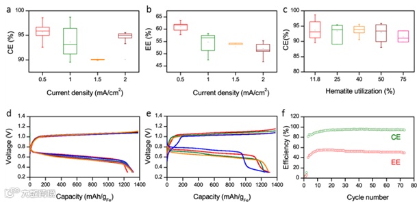 以半固态熔盐作为电解质的高温铁空电池,其性能得到了显著的改善。在不同放电电流密度下,其库伦效率能够保持在90%以上,能量效率最高可达61.2%,循环次数可达80次,运行时间长达113h,在测试中,电池的能量密度可达380.3Wh·kg-1,基于铁质量的容量值高达1300 mAh·g-1,接近电池的理论比容量值。相对于前期的液态熔盐电池性能参数来说,其循环稳定性和能量效率都得到了很大的提高。