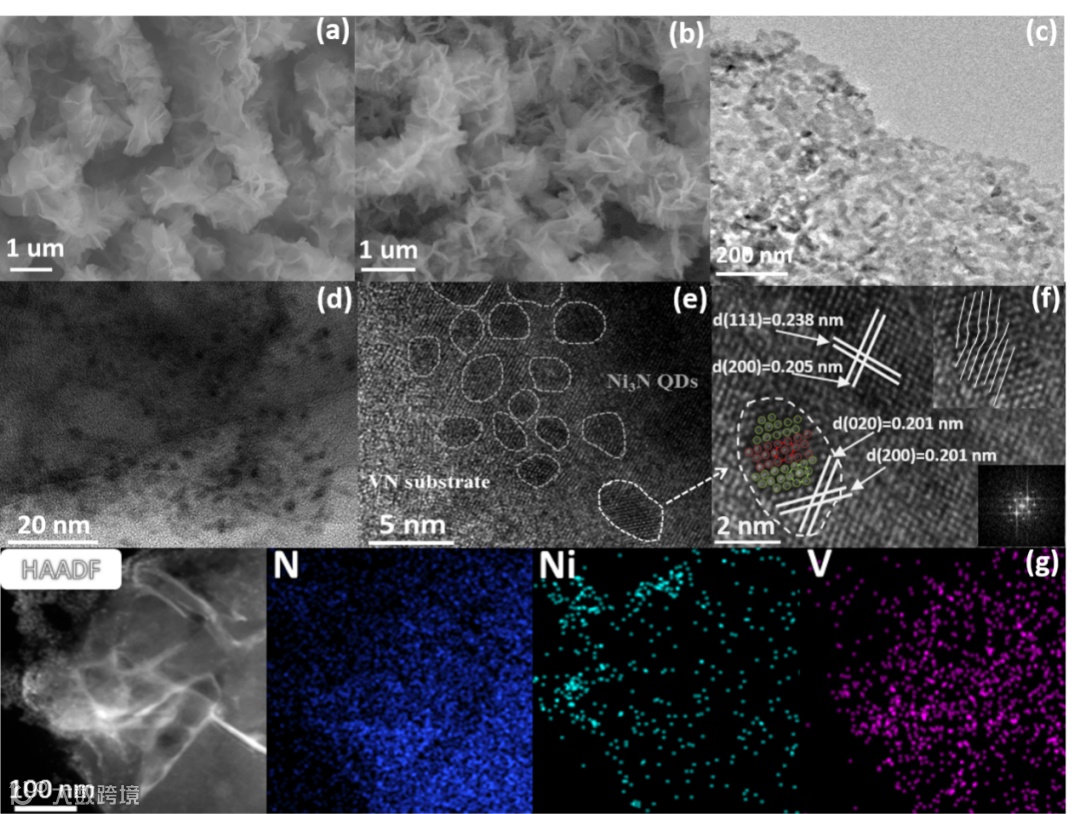 图2:(a, b)毛毛虫状的 VNi(OH)x和D-Ni3N QDs/VN。(c, d)多孔VN纳米片和大规模分布的D-Ni3N QDs。(e, f) D-Ni3N QDs/VN的高倍TEM图和VN基底对应的FFT图。