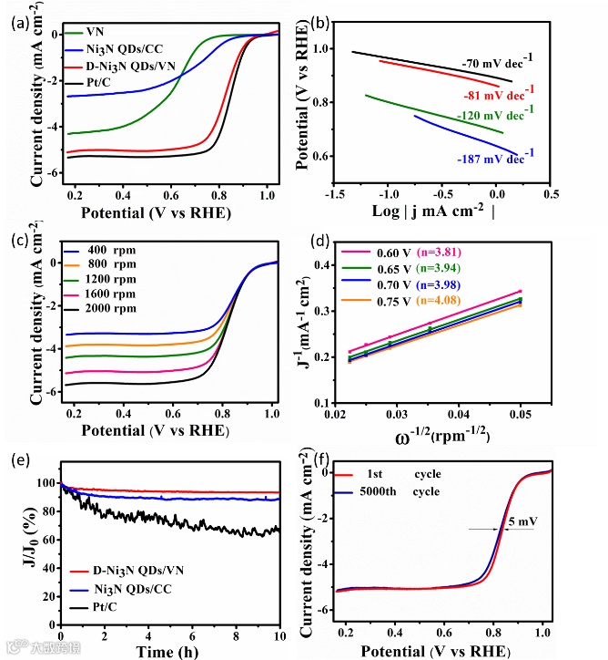 图3: (a) D-Ni3N QDs/VN、Ni3N QDs/CC、VN和Pt/C的LSV曲线(1600 rpm);(b) tafel斜率曲线;(c)不同转速下D-Ni3N QDs/VN的极化曲线;(d)拟合的Koutecky–Levich曲线;(e)稳定性测试;(f) D-Ni3N QDs/VN循环测试前后的极化曲线。