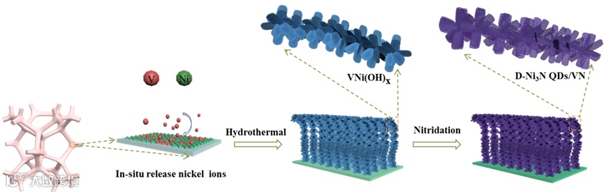 图1:毛毛虫状的D-Ni3N QDs/VN合成路线图。