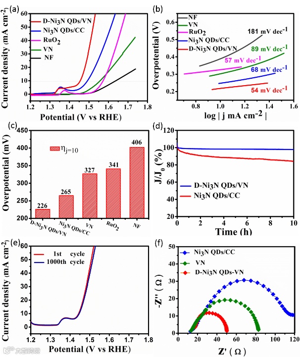 图4 (a) 样品的LSV曲线;(b)对应的tafel曲线;(c) j = 10 mA cm-2处的过电位;(d) 稳定性测试;(e) D-Ni3N QDs/VN循环前后的极化曲线;(f)样品的电化学阻抗谱。
