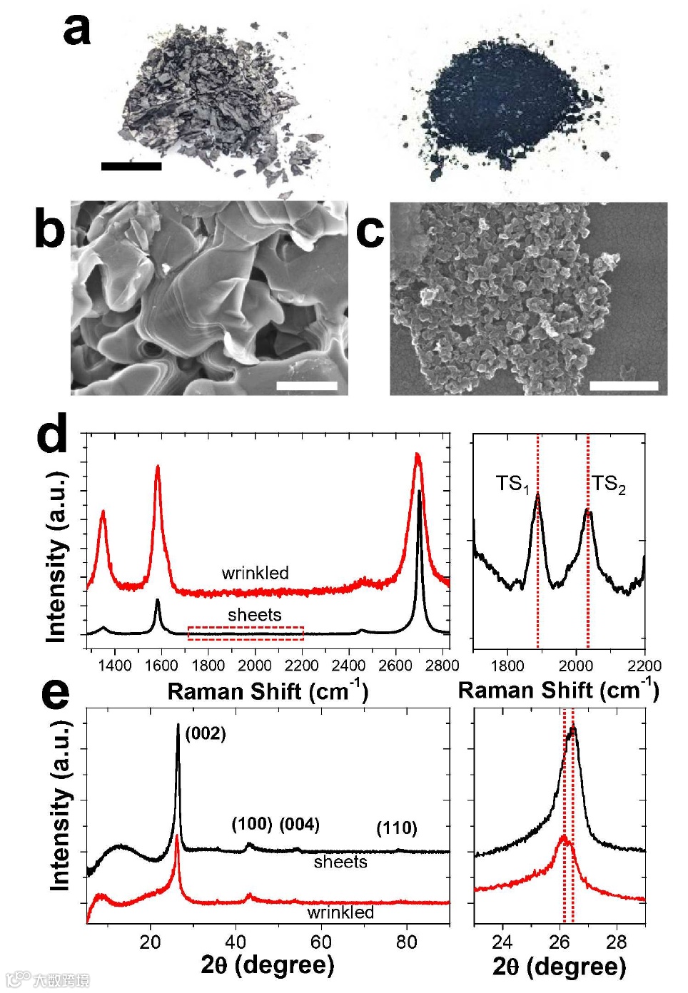 扫描电镜结果表明,图中灰色晶体呈现出具有网络结构的涡轮状闪蒸石墨烯片,该结构比较容易剥落。对于上述不同形态碳材料的物相结构分析表明,XRD图中(002)峰和(100)特征峰符合涡轮层状石墨烯晶体结构特征。值得注意的是,图中涡轮状闪蒸石墨烯薄膜的(002)峰比褶皱石墨烯更明显,这表明c轴上的微晶尺寸更大。