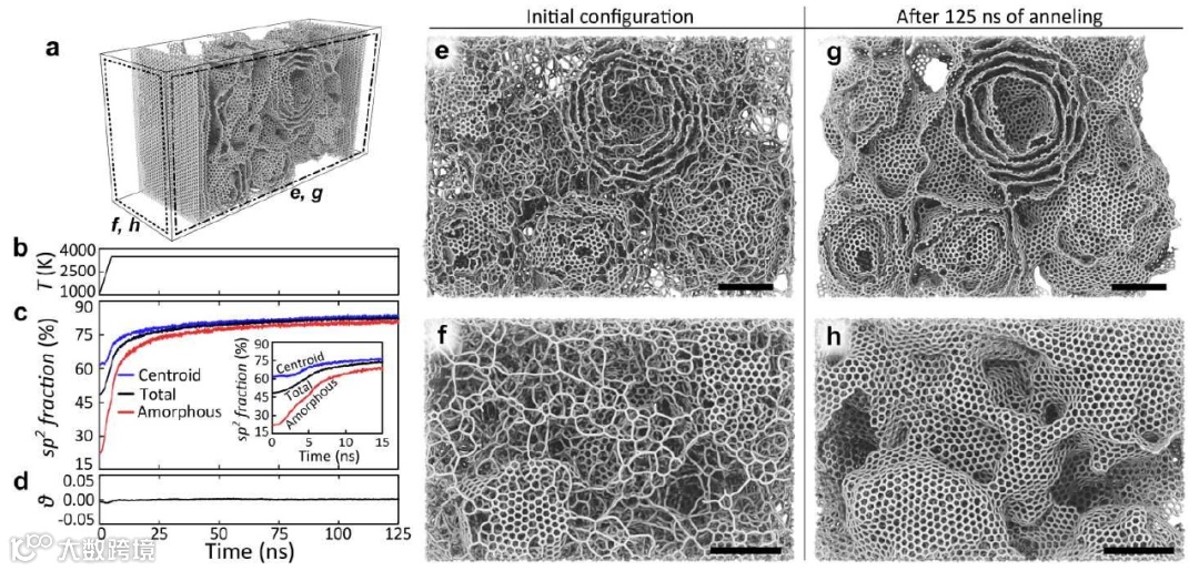 作者采用分子动力学建模的方法来模拟焦耳热闪蒸过程,将初始结构设计为包含约66%的炭黑质心颗粒和约34%的无定形碳。在1000 K初始预处理5 ns后,材料继续置于加热状态,随后在3500 K的恒定温度下退火,同时测量材料的石墨化程度和Herman的取向函数。实验结果表明,在退火过程中,样品的石墨化程度从60%显著增加到85%,其中最显著的变化发生在加热的初始阶段。值得注意的是,与非晶态碳相比,材料质心颗粒的流动性明显降低,这是由于缓慢退火过程使石墨块体中心石墨化程度逐渐增加所致。同时,周围的无定形碳预先形成的微结构经历快速石墨化,从而形成表层包覆类石墨烯涂层。此外,即使在高温(125 ns,3500 K)下的长时间热退火过程中,并未观察到石墨烯的取向度有明显的变化,只观察到褶皱状的石墨烯。从以上实验结果中可看出,材料经过简单热退火趋向于形成褶皱状石墨烯。