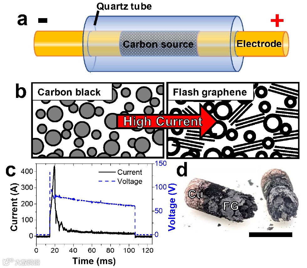 作者首先以炭黑为反应碳源,当超高的电流流经炭黑时,瞬间产生约30 kW的超高功耗,产生的焦耳热在极短的时间内(几十毫秒)将炭黑快速加热至~3000 K,然后在几秒钟内冷却至室温。在放电过程中,炭黑被快速加热并迅速石墨化,形成闪蒸石墨烯。作者认为,这种瞬时高功耗是快速形成焦耳热的主要原因,也是闪蒸石墨烯形成的必要条件。