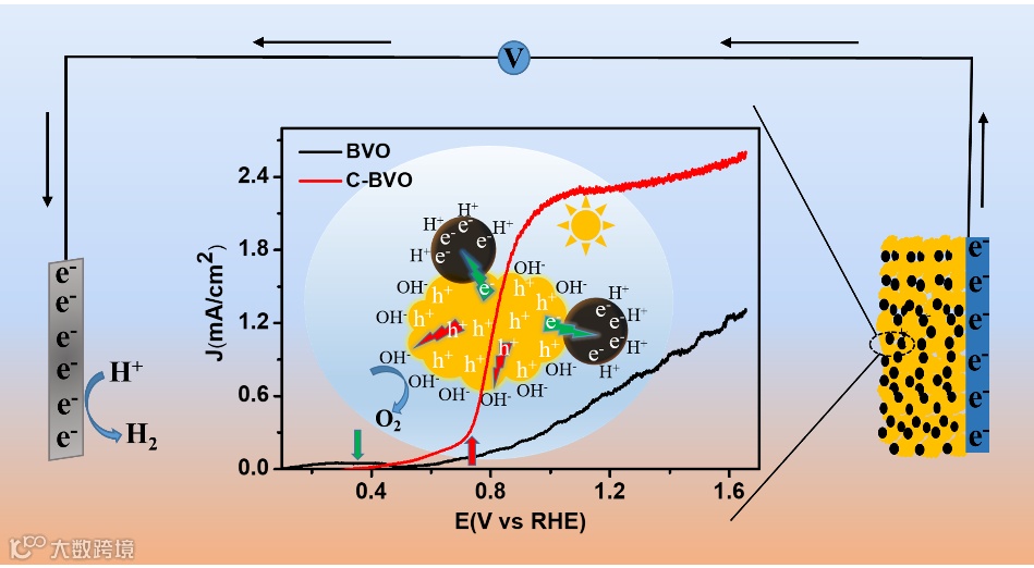 图1是光电化学分解水装置及C-BVO复合光阳极水氧化反应机理图。