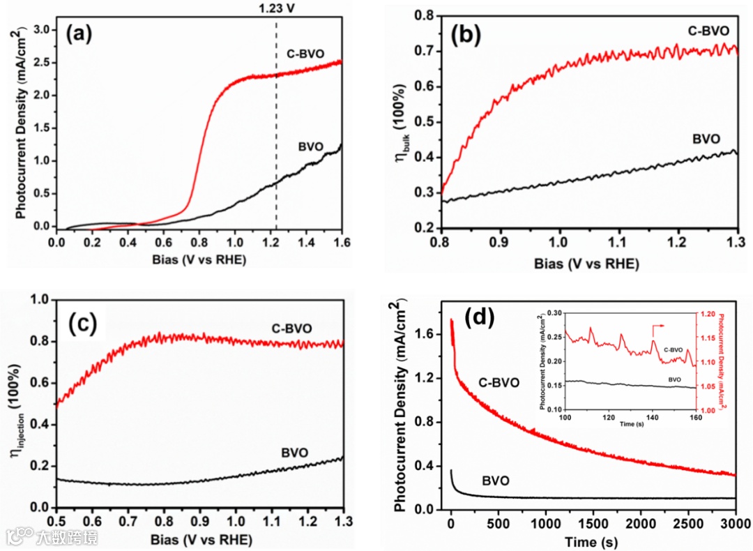 图4中(a)是BVO和C-BVO光阳极的光电流密度-偏压曲线;(b)和(c)分别是两者的内部和界面载流子分离效率-偏压曲线;(d)是光电流密度-时间的稳态电流曲线,插图为其局部放大图,这是证明在C-BVO电极中存在“充放电”过程的直接证据。