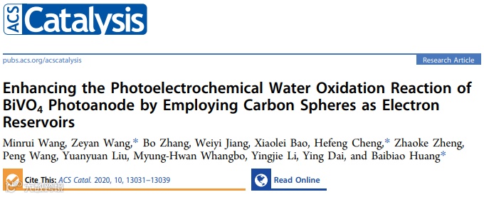 Minrui Wang., Enhancing the Photoelectrochemical Water Oxidation Reaction of BiVO4 Photoanode by Employing Carbon Spheres as Electron Reservoirs, ACS Catal, 2020, 10, 13031-13039.