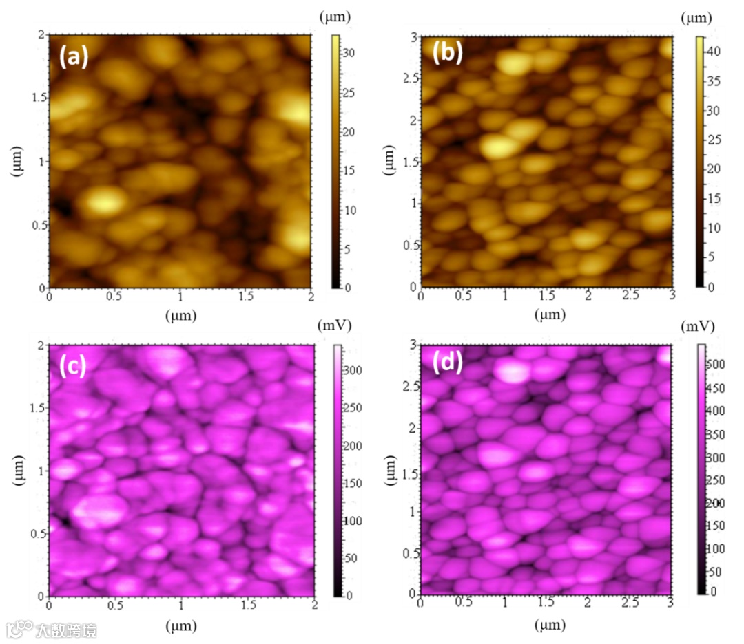 图3中(a)、(b)是BVO和C-BVO的表面形貌图,(c)、(d)分别是两者的表面光电容分布。