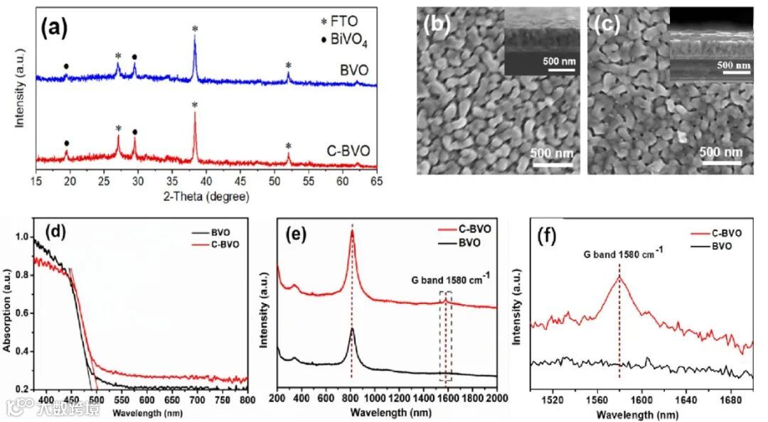 图2中(a)是BVO和C-BVO的XRD图谱。(b)、(c)是BVO和C-BVO的表面SEM图,插图分别是两者的截面SEM图。(d)是两者漫反射吸收光谱的对比图。(e)是两者拉曼光谱的对比图,(f)是(e)的局部放大图。
