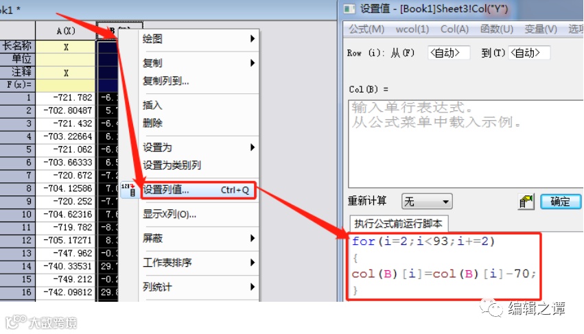 西南交大的Johncy提问:我想把偶数行减去70,奇数行不变,Origin里面可以实现吗?