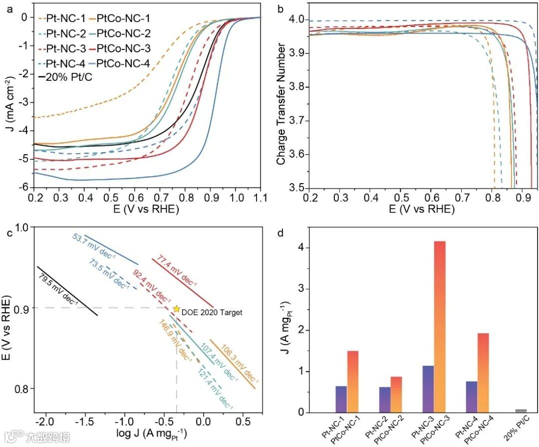 (a) LSV curves of (dashed curves) Pt-NC and (solid curves) PtCo-NC samples in 0.1 M HClO4, and the corresponding (b) charge transfer number and (c) Tafel plots. In panel (c), the star marks the DOE 2020 target.