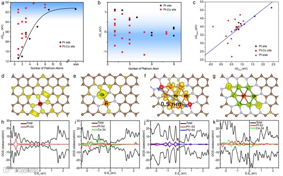 这一增强作用与众所熟知的钴对铂纳米颗粒催化氧还原的增强作用不同:前者通过增加费米能级附近态密度而改善了铂寡原子团簇(或铂单原子)的吸附氧中间体的能力,后者则通过调节晶格应力改善了铂纳米颗粒表面对氧中间体的解离能力。
