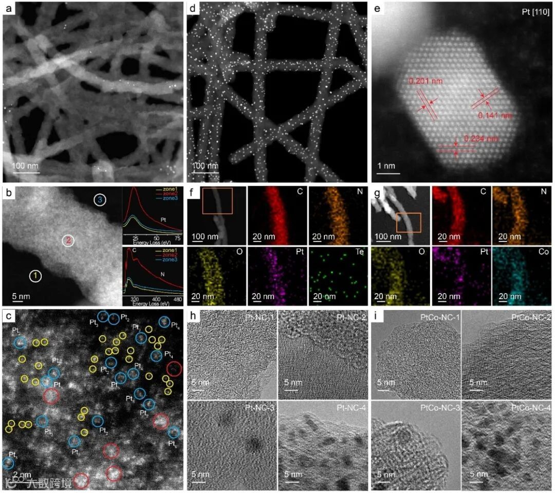 High-resolution TEM images of the (h) Pt-NC and (i) PtCo-NC samples
