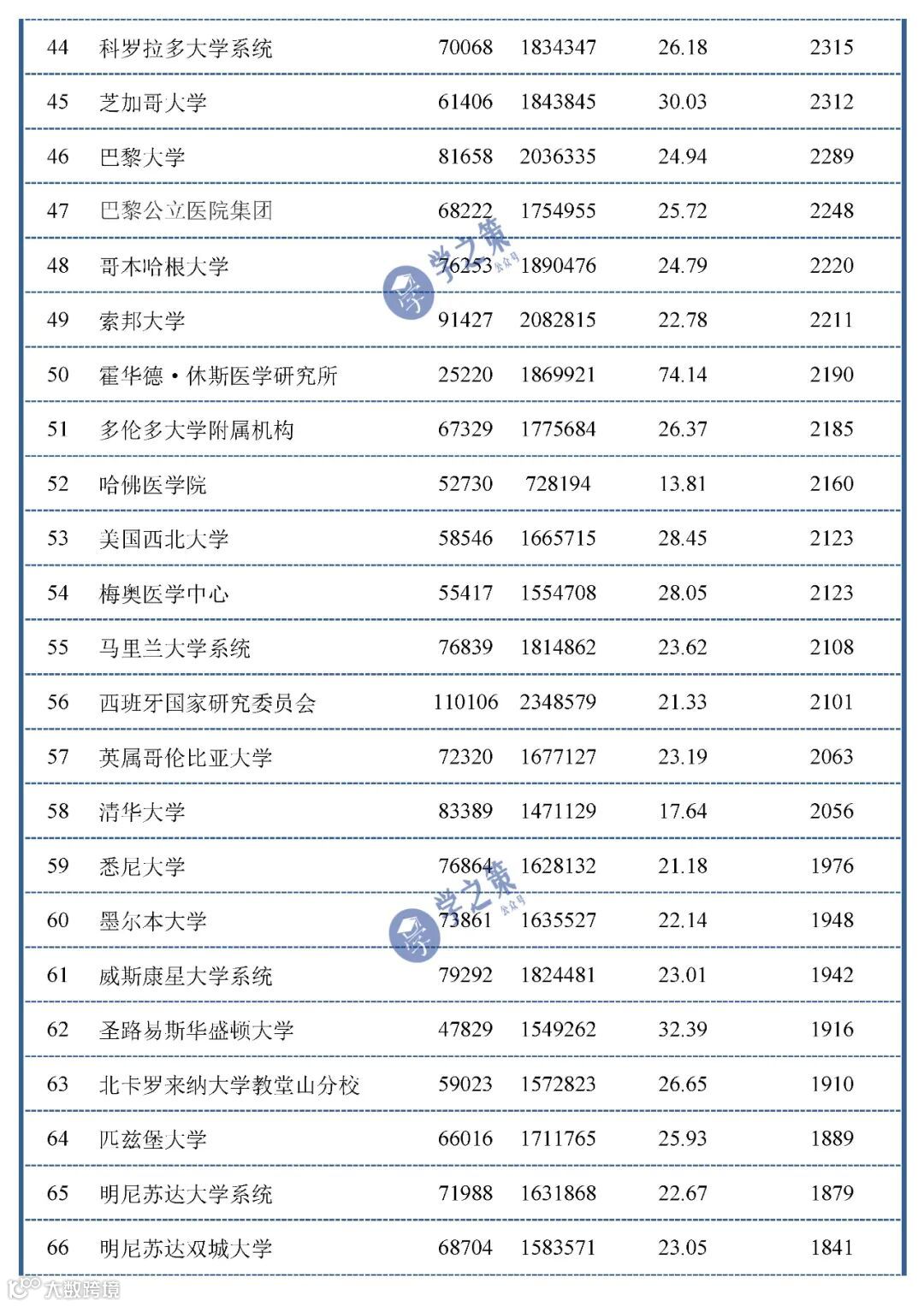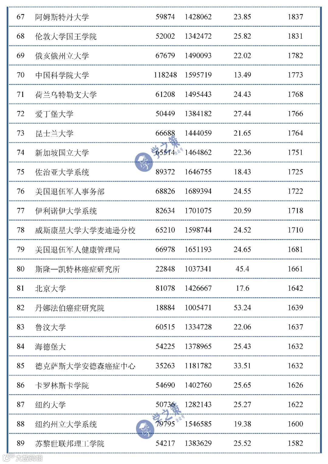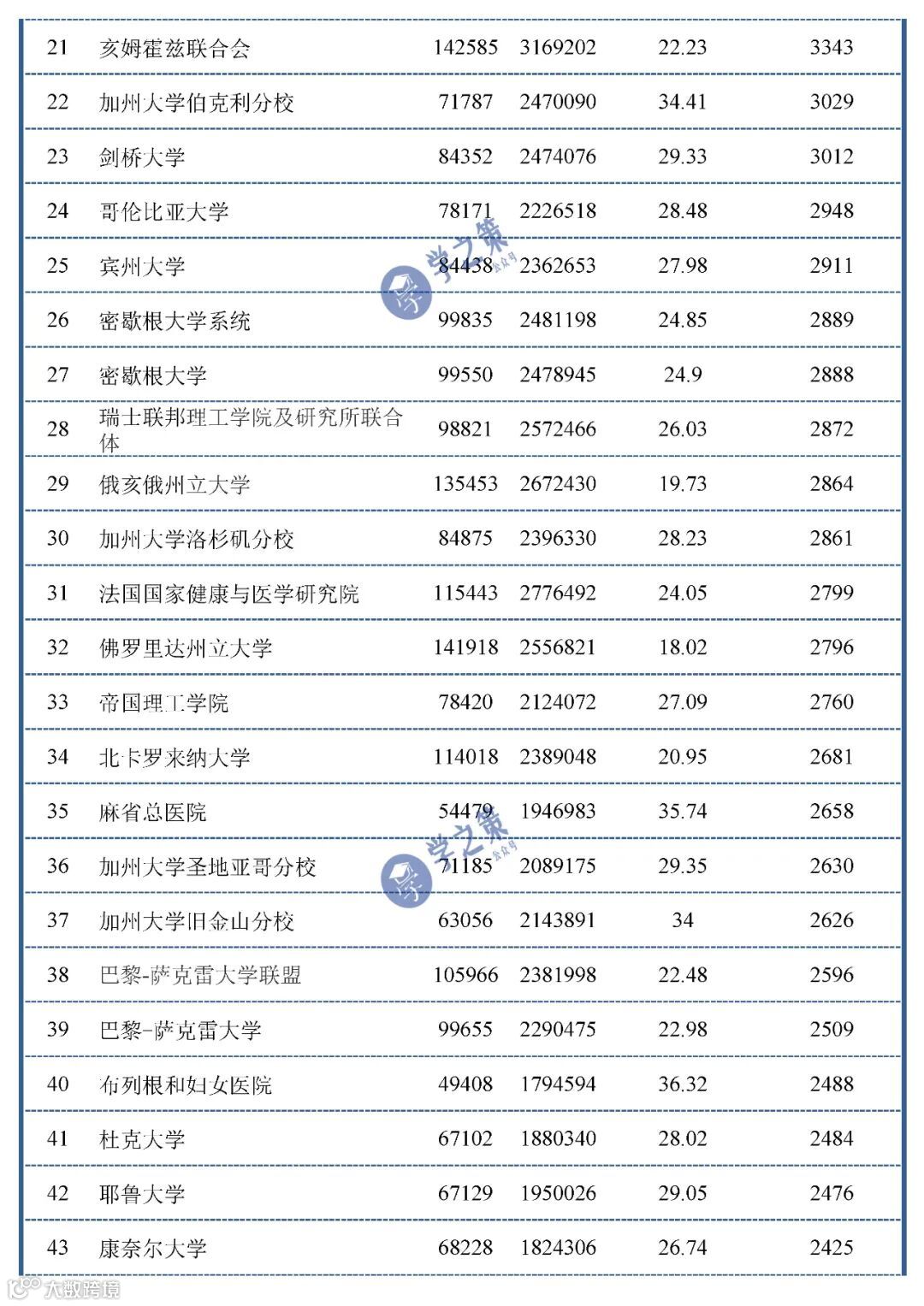 从下面的名单中也可以发现,加州大学的伯克利分校排名22(3029篇),洛杉矶分校排名30(2861篇),圣地亚哥分校排名36(2630篇),旧金山分校排名37(2626篇),戴维斯分校排名96(1477篇)。