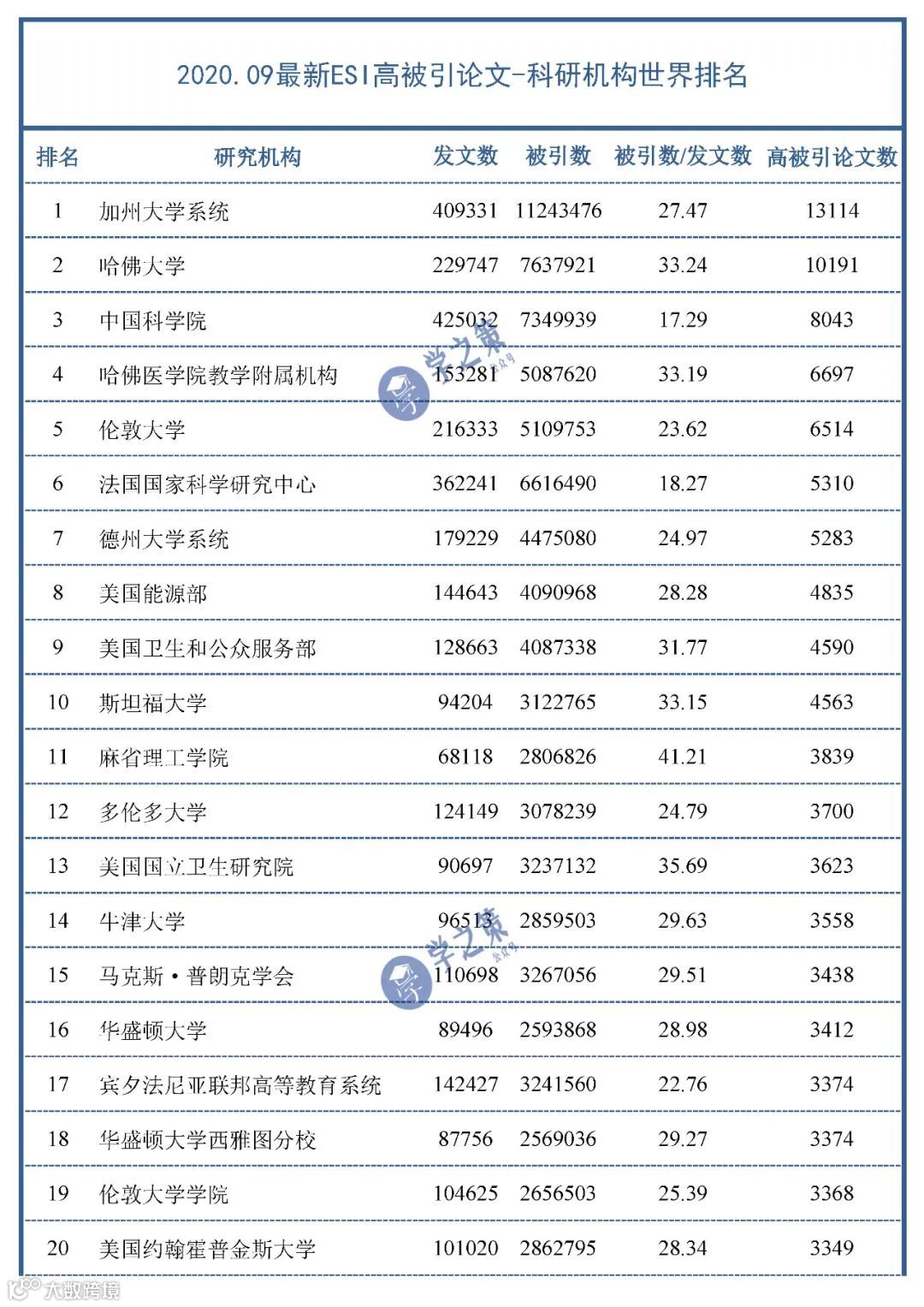 根据2020年9月的最新ESI数据,我们本期整理了世界所有科研机构高被引论文数(包含热点论文)的前100名。