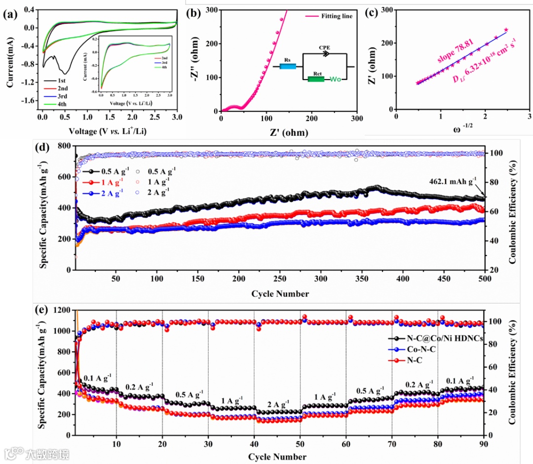 要点二:制备的N-C@Co/Ni HDNCs作为锂离子电池负极材料时表现出优异的倍率性能和循环稳定性。优异的储锂性能主要源自于原子级Co/Ni双金属活性中心高的催化作用,降低了反应活化能,加快反应动力学。