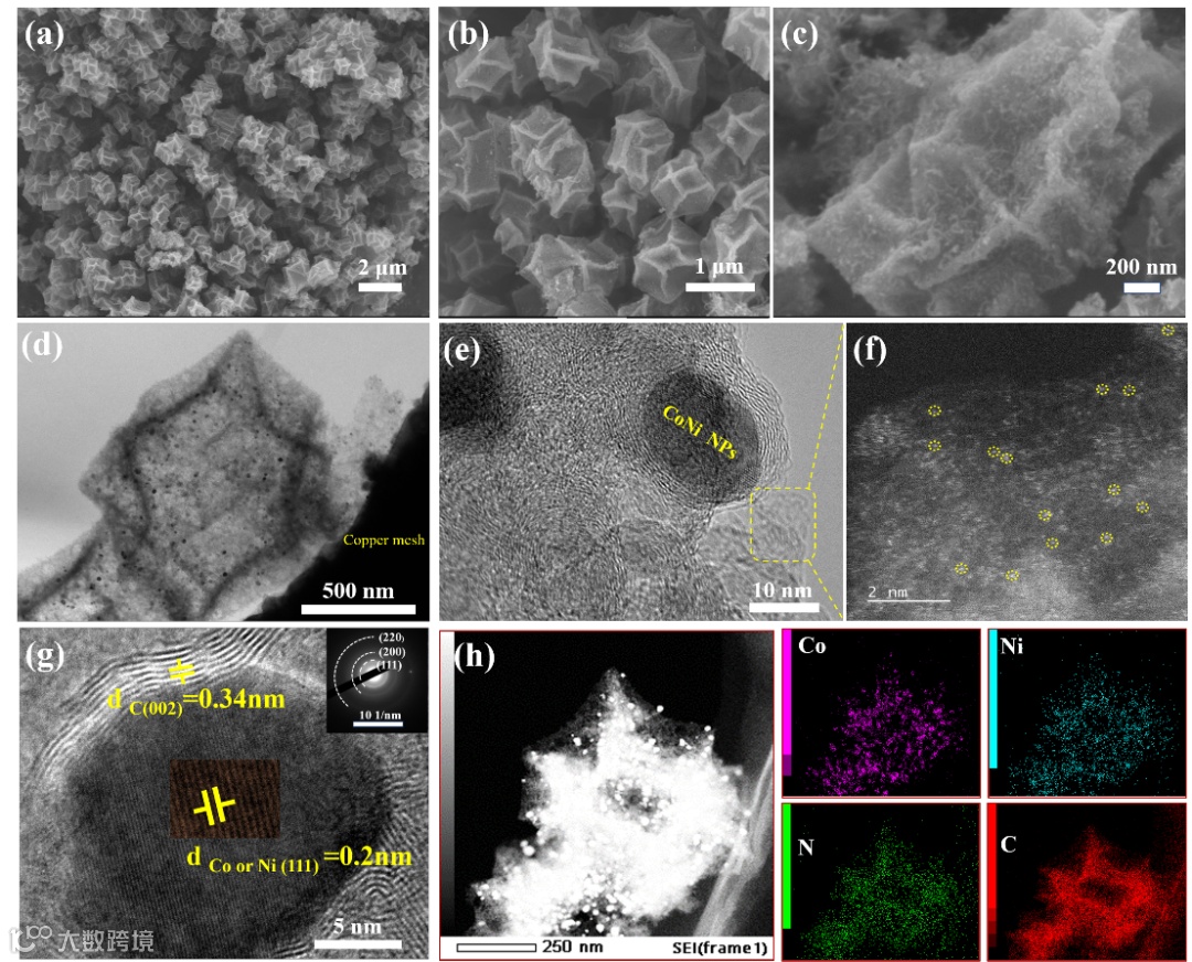 图2 MOFs衍生的氮掺杂超级碳负极材料(N-C@Co/Ni HDNCs)结构表征