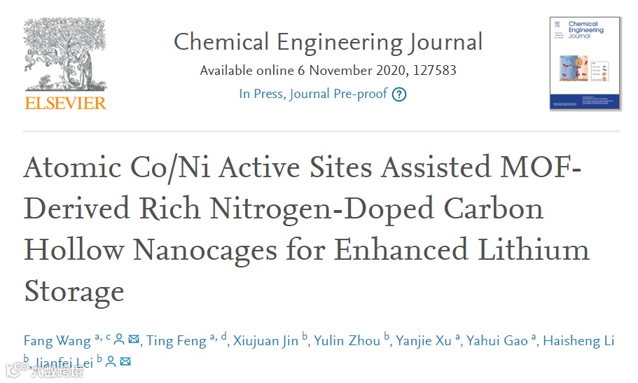 王芳副教授/雷建飞副教授 CEJ:原子级Co/Ni双活性位点助力MOF衍生富氮掺杂碳空心纳米笼储锂性能的提升