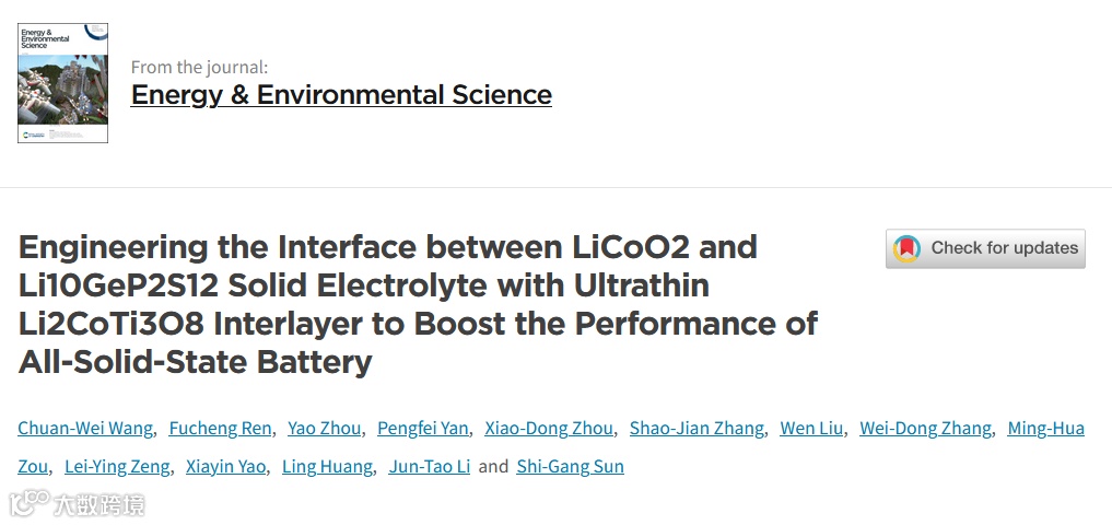 李君涛EES:用超薄Li2CoTi3O8中间层设计LiCoO2和Li10GeP2S12固体电解质之间的界面以提高全固态电池的性能