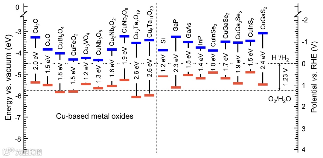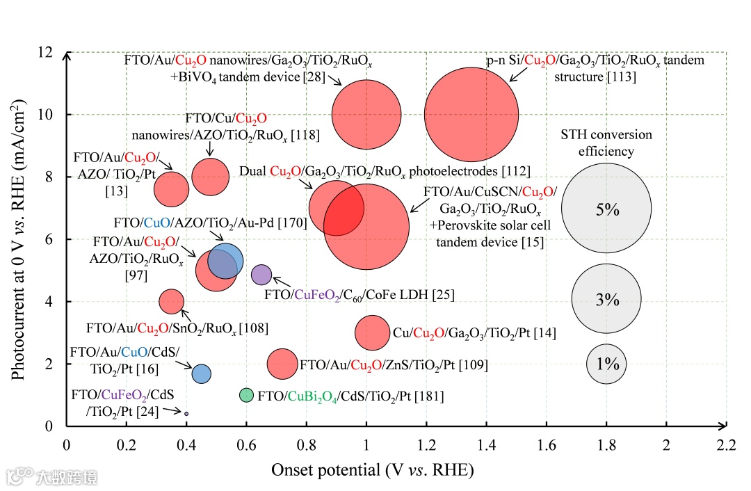 目前基于氧化亚铜的光电极取得了较好的进展。其太阳能-氢能转化效率从2011年的0.78%左右提升到2019年的5.51%(与p-n Si串联)。但是其他二元和三元铜基金属氧化物光阴极在性能提升上进展缓慢。这首先受制于该类材料在作为光阴极使用时极不稳定,自身表面会被还原而不是进行产氢反应。而大部分的课题组基于该类材料的研究都集中在引入纳米结构、掺杂等手段来提高材料“光活性”,对其真正产氢性能的提升提供的参考信息十分有限。因为只有在获得合理保护时光电极之间才能进行有意义的性能比较。