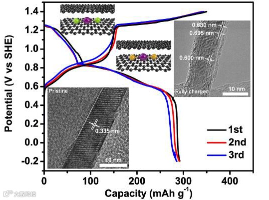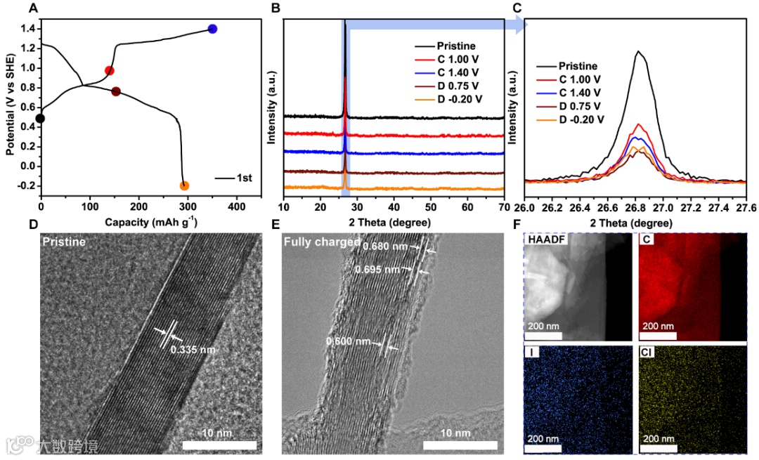 图二. 石墨电极在充放电不同电位下的XRD、HRTEM图及元素分析。