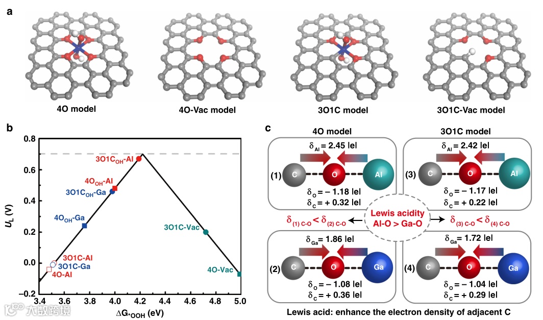 该工作从理论和实验上发现,原子级分散的路易斯酸位点(八面体M–O物种,M=铝(al),镓(Ga))能调节相邻碳催化位点的电子结构。密度泛函理论计算预测,具有强路易斯酸性的八面体M–O调节了相邻碳位的电子分布,从而优化了反应中间体(*OOH)的吸附和脱附强度。