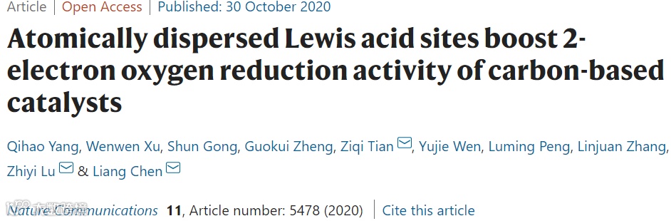 近日,中国科学院宁波材料研究所田子奇,陆之毅,陈亮研究员等在国际顶级期刊nature communications (影响因子:12.121)上发表题为“Atomically dispersed Lewis acid sites boost 2-electron oxygen reduction activity of carbon-based catalysts”的研究工作。