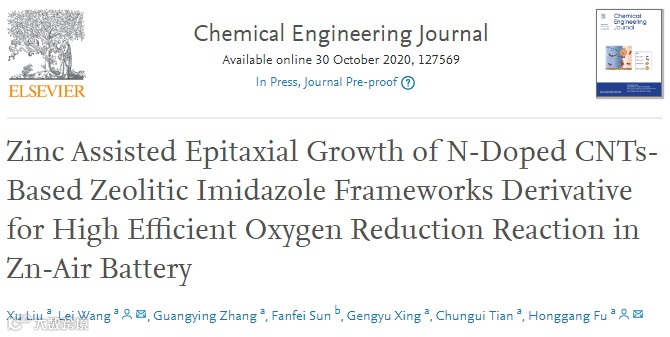 近日,来自黑龙江大学的付宏刚教授和王蕾教授,在国际知名期刊Chemical Engineering Journal(影响因子:10.652)上发表题为“Zinc Assisted Epitaxial Growth of N-Doped CNTs-Based Zeolitic Imidazole Frameworks Derivative for High Efficient Oxygen Reduction Reaction in Zn-Air Battery”的文章。