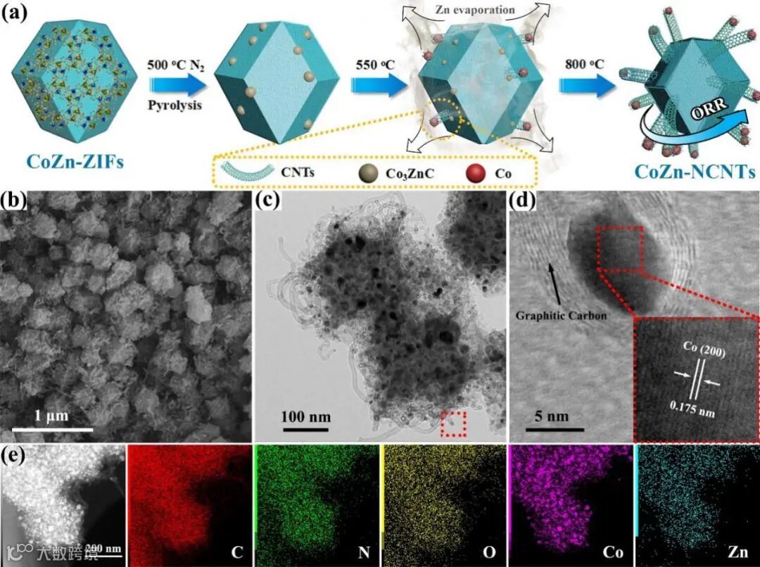 图1. CoZn-NCNTs催化剂的合成示意图,以及相应的电镜表征图。