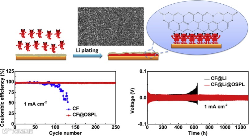 来自三聚氰胺和氰尿酸的许多极性基团(例如氨基,羰基和三嗪)可以通过吸引锂离子并重新排列锂沉积来分散浓度高的锂离子通量。极性基团之间形成的大量氢键为OSPL提供了良好的弹性,这使其不易断裂并且可以减轻Li镀层的体积膨胀。