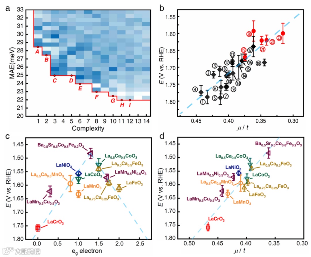 图3a描述了本工作通过符号回归筛选描述子(数学表达式)的流程。在这项工作中,符号回归最初组合这些材料特征以及常用的运算符,如加、减、乘、除、开根号,来建立一个随机数学表达式群。然后,这些数学表达式通过遗传算法进行繁殖、变异、进化,形成新的数学表达式(图3b)。这些数学表达式通过预测的和实验得到的VRHE之间的平均绝对误差(MAE)来评估优劣。