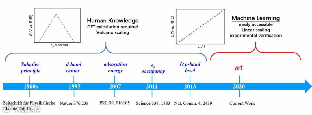 过去10年来,人们针对氧化物钙钛矿的析氧反应活性,提出了诸多描述子,主要有过渡金属离子(TM) eg轨道占据数 (Science 2011, 334,1383);催化反应自由能(ChemCatChem 2011, 3, 1159);O p带位置 (Nat. Comm. 2013, 4,2439),以及TM和O的共价相互作用 (Nat. Comm. 2020, 11,652)等(如图1所示)。