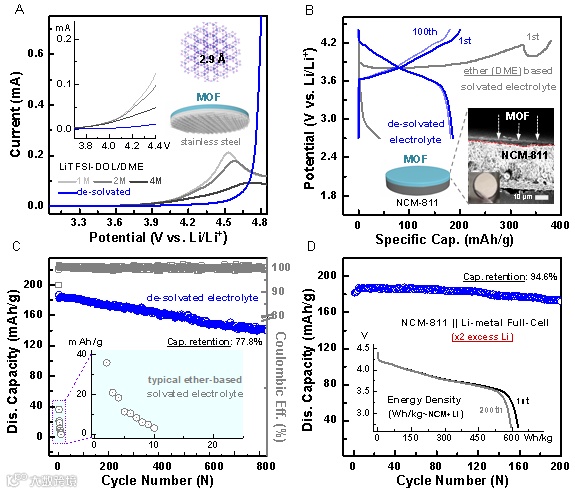 该电解液由非活性的“冻结状”溶剂分子和去溶剂化锂离子-阴离子构成的类晶体状盐溶质组成。通过预先将锂离子的去溶剂化过程从高反应活性的电极表面转移到稳定且绝缘的金属有机框架(MOF)孔道内(2.9 Å),最终获得了这种“Li+去溶剂化的(醚基)电解液”。得益于特殊的电解液结构,该电解液的电化学窗口被拓宽到4.5 V。该研究为高比能锂金属电池电解液的开发提供新思路。