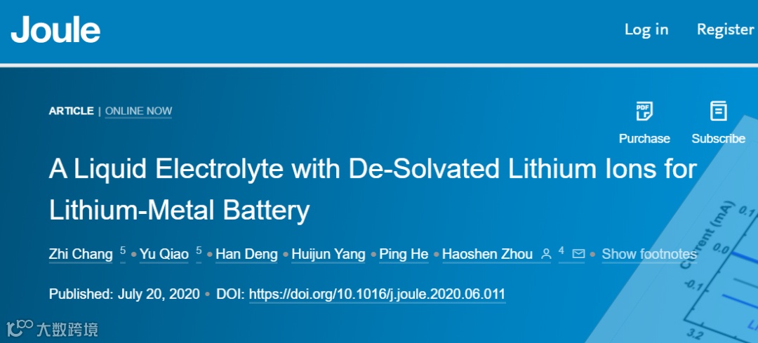 近日,南京大学周豪慎课题组联合日本产业技术综合研究所(AIST)和国立筑波大学(University of Tsukuba)在国际顶级期刊Joule (影响因子:27.054) 上发表题为“A Liquid Electrolyte with De-Solvated Lithium Ions for Lithium-Metal Battery”的研究工作。
