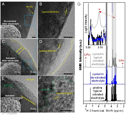 图4C和4D表明,使用“Li+溶剂化的醚基电解液”(1M LiTFSI-DOL/DME) 循环后的NCM-811正极颗粒虽然液能够维持稳定的层状结构,但正极颗粒表面被厚的CEI层覆盖。