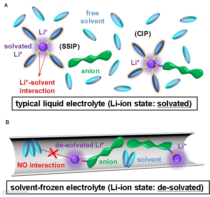 电解液是各种电化学储能设备/体系,如锂离子电池(LIB)/锂金属电池(LMB)体系成功运行的关键所在。在各种电解液体系中,有机液体电解液是LIB/LMB最常用的电解液体系。因为常规有机液体电解液由溶剂分子,阴离子以及溶剂化的锂离子组成,且遵循典型的“溶剂化锂离子”电解液构型,因而我们将其定义为“Li+溶剂化的电解液”。然而,这些常规的有机液体电解液(稀电解液或浓电解液)存在一个难以避免的缺陷:溶剂分子导致的电解液分解问题。