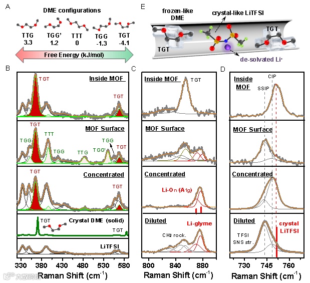 在此工作中,通过将锂离子的去溶剂化过程提前从高反应活性的电极表面转移到稳定且绝缘的金属有机框架(MOF)孔道内(ZIF-7, 2.9 Å),Li+与溶剂(DME)之间的相互作用被MOF的小孔窗口阻断,最终获得了特殊的“Li+去溶剂化的(醚基)电解液”。