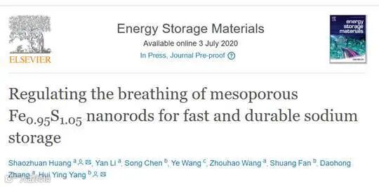 近日,中南民族大学的黄绍专博士和新加坡科技设计大学的杨会颖(Yang Hui Ying)副教授在国际知名期刊Energy Storage Materials(IF:16.28)上发表题为“Regulating the Breathing of Mesoporous Fe0.95S1.05 Nanorods for Fast and Durable Sodium Storage”的研究工作。