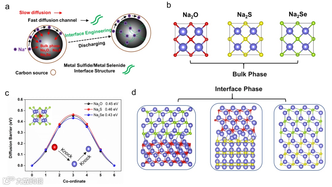 作者系统地研究了放电产物(Na2O、Na2S、Na2Se)不同类型异质结界面对倍率性能的影响。第一性原理计算表明,在Na2O/Na2S、Na2O/Na2Se、Na2S/Na2Se三种界面结构中,Na2S/Na2Se界面由于其最小的界面变形、相似的电负性和晶格常数,具有最低的Na扩散能垒(0.39 eV)。